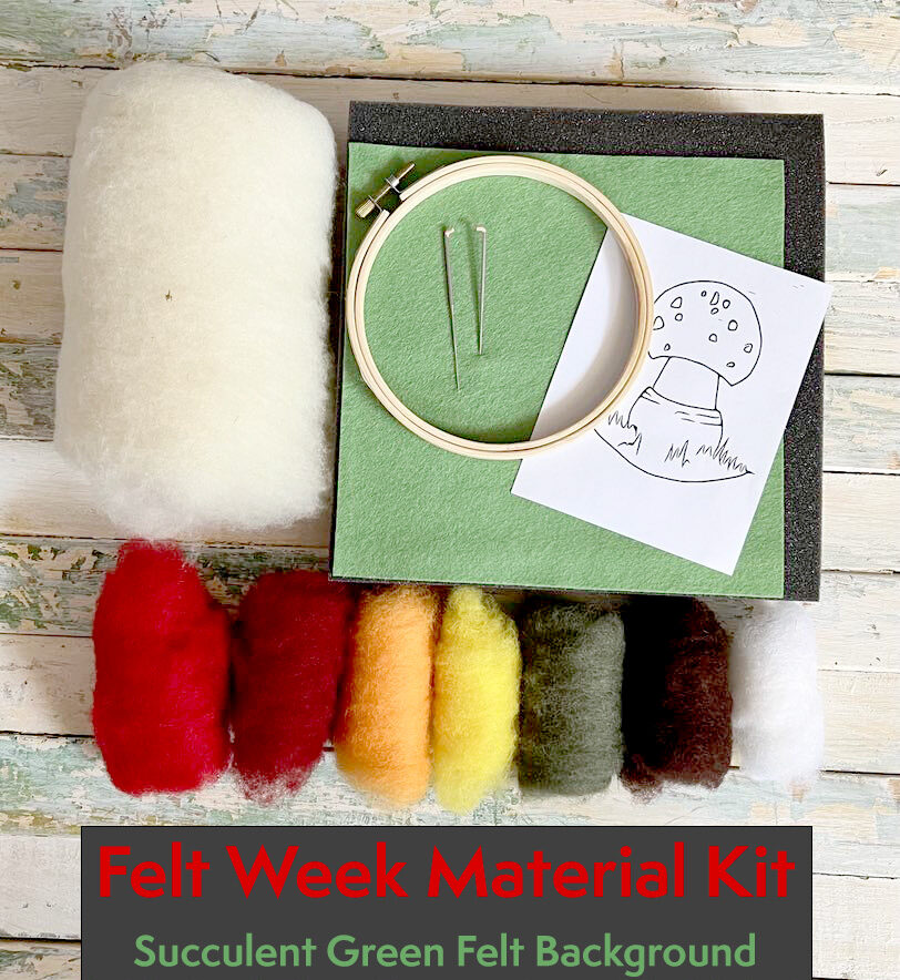 Contains: Core Wool, Coloured Batt, Felting Base, 2 x 38 Star Felting Needles, Embroidery Hoop, Wool Felt (choose between Succulent Green or Beige marble), Printout of 2D mushroom pattern.