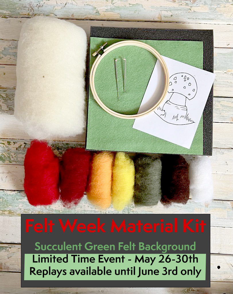 Contains: Core Wool, Coloured Batt, Felting Base, 2 x 38 Star Felting Needles, Embroidery Hoop, Wool Felt (choose between Succulent Green or Beige marble), Printout of 2D mushroom pattern.