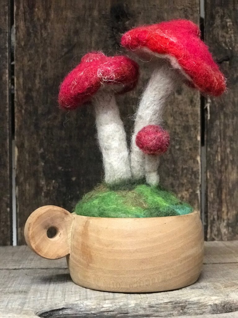 Includes all materials – for 5 mushrooms, a foam base, 2 felting needles, 3 hours instruction time.